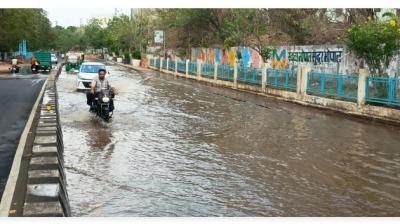 7 Apr, 2026 09:44 PM ISTभोपाल में लोक भवन के सामने सड़क धंसी, पानी बहने...