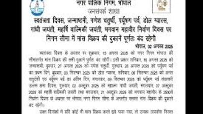 भोपाल। चैत्र नवरात्रि के पवित्र पर्व के दौरान भोपाल नगर निगम ने बड़ा ऐलान किया है. भोपाल नगर निगम ने अपने दायरे में आने वाली मांस-मीट की सभी दुकानों को...