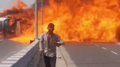 नेशनल हाईवे पर तेल टैंकर पलटा, 200 मीटर तक फैली भीषण आग