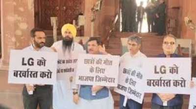 संसद में आप सांसदों का विरोध-प्रदर्शन एलजी को बर्खास्त करने की मांग